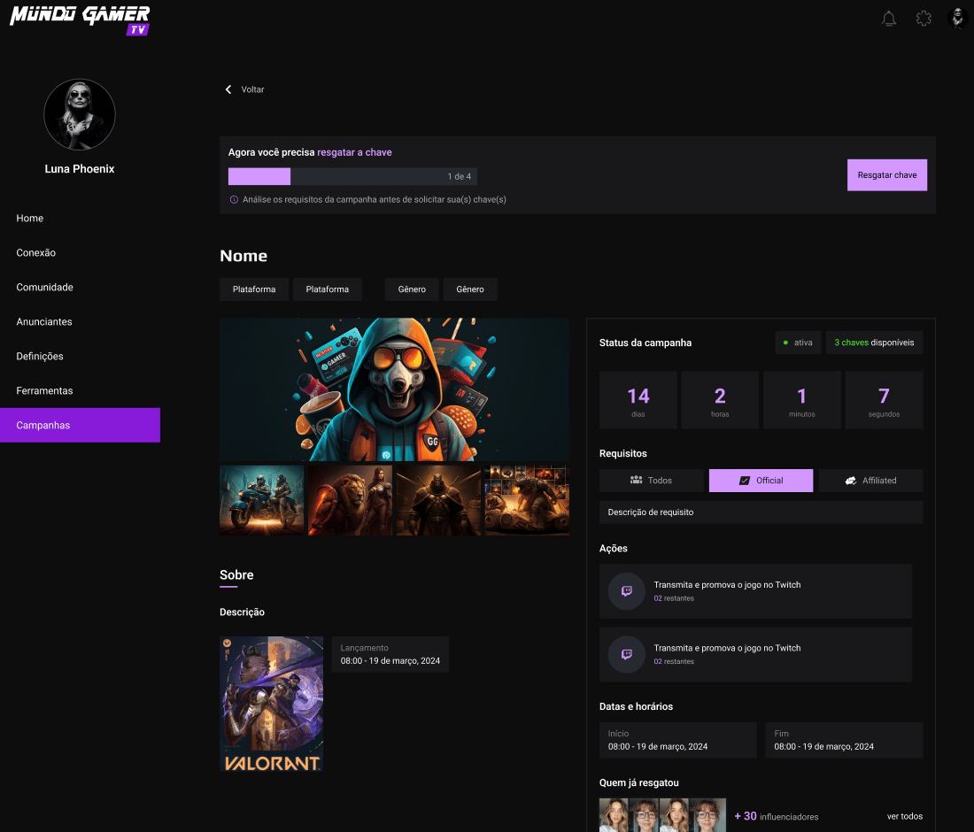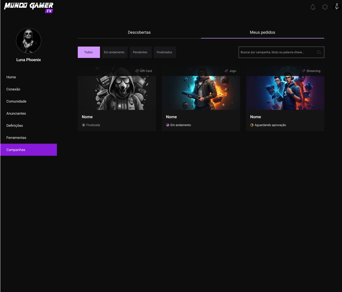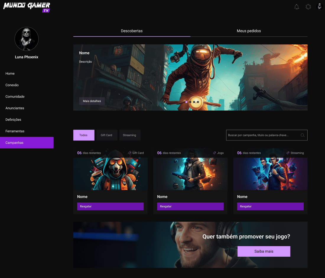 Dei continuidade ao projeto existente, ampliando suas funcionalidades e a profundidade da experiência do usuário. Estruturei novos fluxos como o de conexão de canais (criação ou integração de perfis existentes), o de comunidade, permitindo gerenciar streamers, seguidores e conteúdos salvos, além dos fluxos de definições de perfil e de resgate de chaves de jogos. Cada etapa foi projetada para manter a coerência da navegação e oferecer uma interação fluida, funcional e alinhada ao ecossistema da Network.